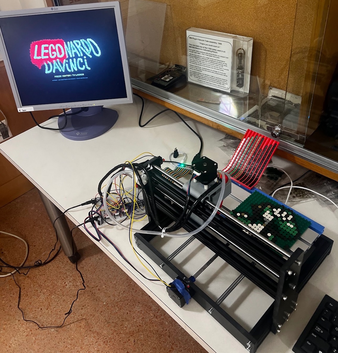 legonardo davinci is a bare-metal printer, fully coded in C and Assembly, using LEGO bricks as ink to "print" scaled-down, images. Users upload images via a Python script, control print settings through a MangoPi interface, and monitor real-time progress, resulting in LEGO-based artwork.